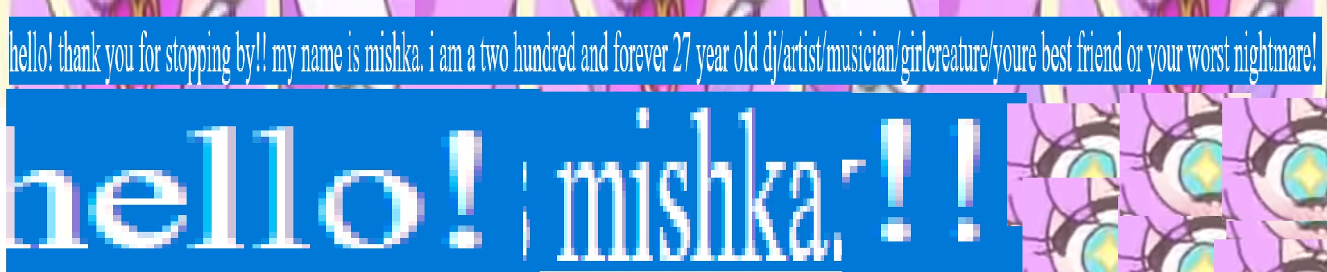 hello! thank you for stopping by!! my name is mishka. i am a two hundred and forever 27 year old dj/artist/musician/girlcreature/youre best friend or your worst nightmare!